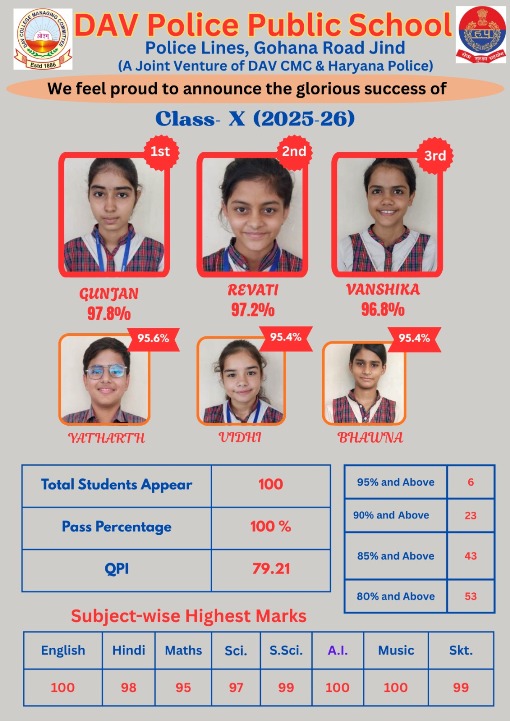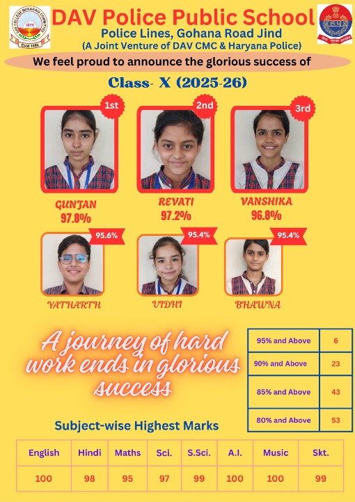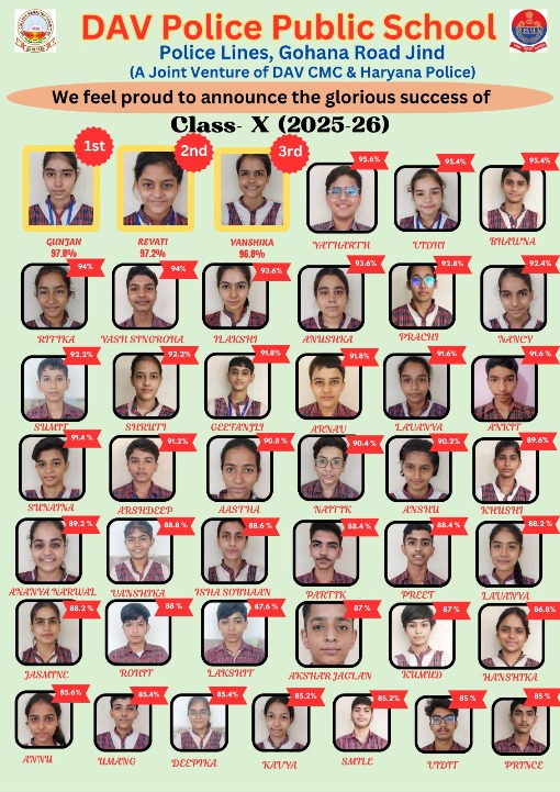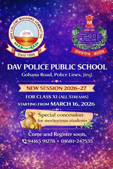 D.A.V. Police Public School, Jind is an English Medium, Co-Educational Institution to be affiliated to C.B.S.E., New Delhi up to Senior Secondary level The school today enjoys a reputation for outstanding performance in academics, sports and other co curricular activities and it is renowned for its Excellence in the field